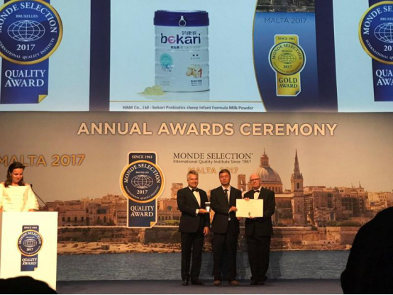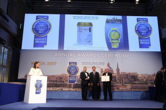 2017年5月29日下午在马耳他首都瓦莱塔地中海会议中心(Mediterranean Conference Centre),具有食品界“诺贝尔奖”之称的世界食品品质评鉴大会颁奖晚会如期举行。宜品乳业董事长牟善波先生第二次受邀参加世界食品品质评鉴大会颁奖典礼,宜品乳业旗下的宜品金装益生菌婴幼儿配方奶粉蝉联超金奖,成为全球为数不多蝉联超金奖的奶粉品牌; 旗下的蓓康僖婴幼儿配方奶粉获得了金奖,据了解,这是全球首款也是唯一一款获金奖的纯羊品牌。