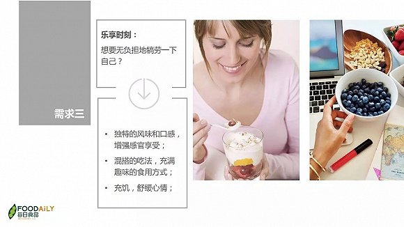 整体上来说,这些消费场景下,人们更多关注的品尝美味时所带来的愉悦感,但随着健康意识的增强,如何无负担地消费,或减少食用时的罪恶感,也是需要考虑的。因此,Foodaily认为具有以下特征的产品概念可能更容易满足消费者乐享的需求: