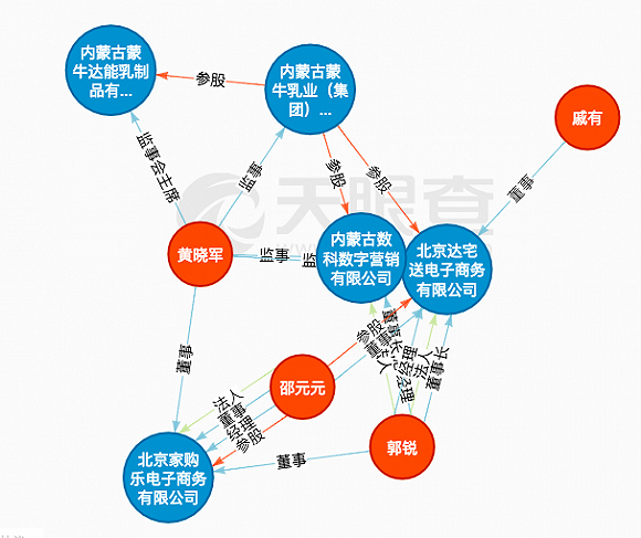达宅送的大股东为蒙牛乳业,注册地址在北京市通州区小甘棠村西(蒙牛乳业(北京)有限责任公司院内),注册时间为2016年9月,今年1月还因蒙牛增资出现了一次变更,但目前该企业状态为“注销”,原因不明。家购乐的企业状态为开业,13名高管中,郭锐、张平、黄晓军、董先都是蒙牛系出身,邵元元在该家公司中出任董事和经理职务。