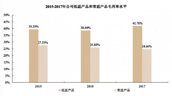 招股书披露的最近三年业绩显示,2015-2017年,新希望乳业营业收入为39.15亿元、40.53亿元和44.22亿元,同期净利润为2.97亿元、1.46亿元和2.16亿元。从营业收入、各类产品占比、毛利率贡献占比等类目看,低温产品的营收为新希望乳业贡献了一半以上的业绩,该品类产品的毛利率也远高于常温产品。