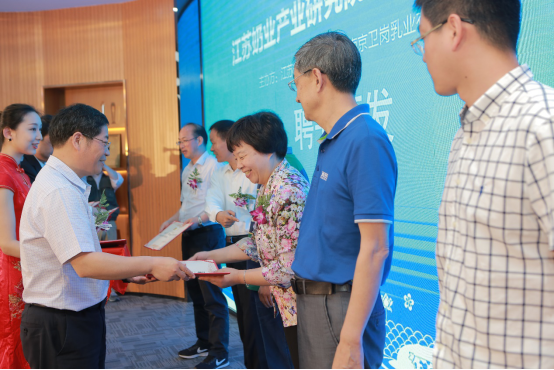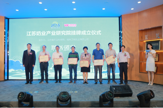 签约仪式完成后,易中懿院长与白元龙董事长为江苏奶业产业研究院各位技术委员会委员颁发聘书,他们分别是:江苏省奶协会长、南京农业大学王根林教授,动物营养国家重点实验室主任、中国农业科学院王加启研究员,国家奶牛产业技术体系岗位科学家、中国农业大学施正香教授,浙江省奶协副会长、浙江省农业科学院蒋永清研究员,江苏现代农业(奶牛)产业技术体系岗位科学家、扬州大学杨章平教授,国家奶牛产业技术体系岗位科学家、 山东省农业科学院杨宏军研究员。6位专家学者将共同为产业研究院提供强有力的技术指导。