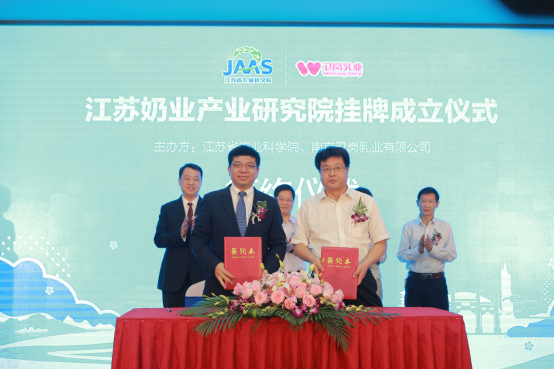 随后,江苏省农业科学院党委副书记王刚与卫岗乳业分管副总裁龚浩代表双方上台完成签约,杨瑛处长、易中懿院长、白元龙董事长、张勇奇副主任,共同见证了这一历史性的时刻。
