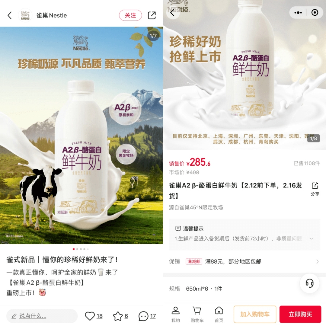 日前,雀巢公司在进入中国市场以后,首次推出低温鲜牛奶产品“A2 β-酪蛋白鲜牛奶”。1月初,雀巢官方账号在小红书上发布新品上市信息,并在微信商城上线该新品。而雀巢官方向界面新闻表示,产品将于2月底正式上市,希望产品准备成熟时再向外发布。