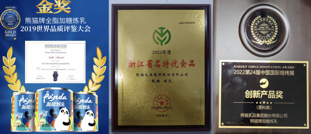 熊猫牌炼乳系列已经拥有几十年的历史,凭借纯正口感和稳定出品一直以来广受消费者和专业人士的青睐。在2019年熊猫牌全脂加糖炼乳以优异的口感和专业的技术荣获了有“食品届诺贝尔”之称的世界品鉴大会金奖;2021年熊猫炼乳获选浙江名特优产品;2022年熊猫炼乳在国际焙烤盛会中斩获“产品创新奖”荣誉等一系列奖项。