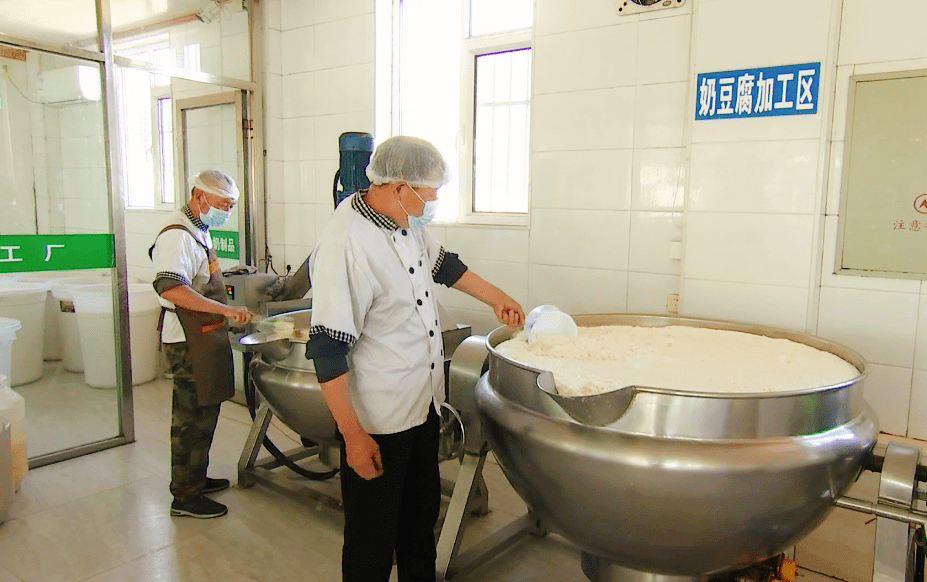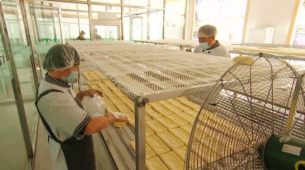 在甘旗卡蒙泰元奶制品加工厂加工车间,浓郁的奶香扑鼻而来,工人们正将牛奶熬制成奶皮、奶酪等奶制品。“现在我们用的奶皮子的机子一个架子上有216个锅,总共12个架子,一下子能做出216个奶皮子”。蒙泰元奶制品加工厂负责人巴特尔说。