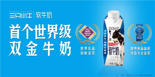 凭借高度的社会责任感、有温度有深度的情感触达、创新的研发理念、以及高品质的营养,三只小牛获得消费者的高度认可,已然成为举世瞩目的“国货之光”!在最近举办的世界乳业大会上,三只小牛旗下的「高钙软牛奶」斩获最佳创新乳品金奖。全球乳业大会是全球乳业首屈一指的重量级论坛,指引了乳业发展的未来趋势,「高钙软牛奶」的获奖无疑向全球乳业同仁展示了中国乳业的技术实力与创新成果。此外,今年4月,三只小牛「高钙软牛奶」也荣获了世界食品品质评鉴大会金奖,后者素有“食品界的诺贝尔奖”之称,这无疑是对三只小牛高品质与引领性地位的又一次肯定,三只小牛高钙软牛奶也成为了品牌首获世界级双金奖的明星产品。